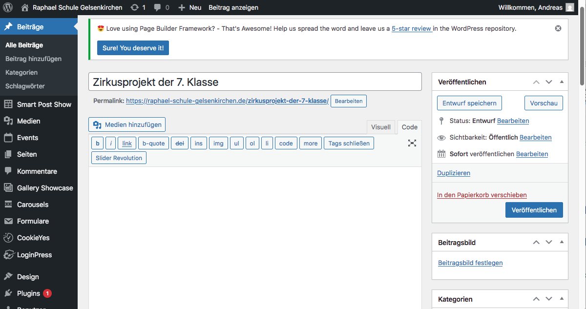 Ein Beitrag kann wahlweise mit HTML-"Code" oder "visuell" erstellt werden.
