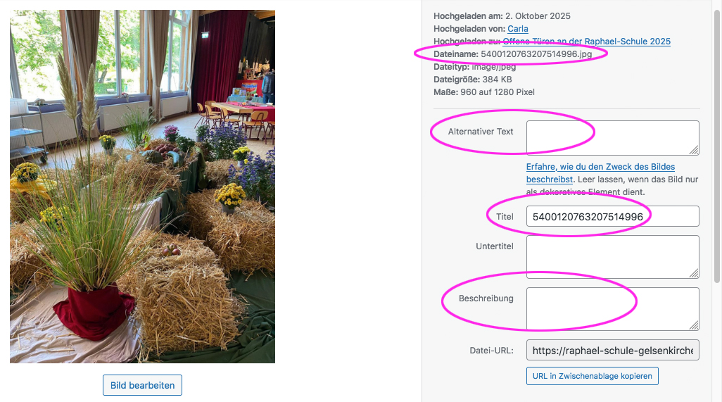 Bildern werden in der Medienverwaltung eine „Bildbeschreibung“ (Felder rechts) hinzufügen.